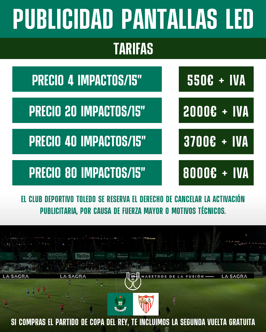 El club informa que cualquier empresa o entidad interesada en aparecer en la nueva Valla LED Digital del Salto del Caballo puede hacerlo poniéndose en contacto con el Departamento de Patrocinios del CD Toledo a través del correo info@cdtoledo.es. Todos aquellos que compren el partido de Copa del Rey, tendrán incluida la segunda vuelta de manera gratuita.