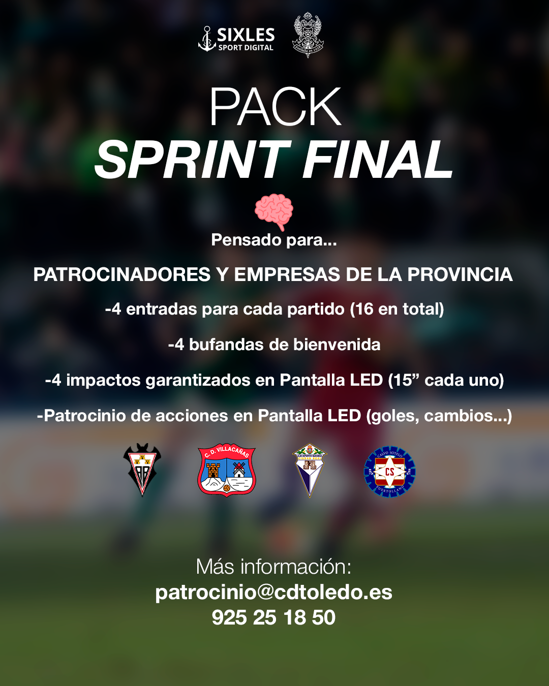 El Club Deportivo Toledo lanza el Pack Sprint Final para empresas y patrocinadores de la provincia de cara a los últimos 4 partidos de Liga en el Salto del Caballo (Atlético Albacete, CD Villacañas, CD Manchego, CS Puertollano). En el tramo más decisivo de la temporada, el Club quiere contar con el apoyo del tejido empresarial de la provincia. Por ello, el Pack Sprint Final es una oportunidad única para que empresas y patrocinadores se sumen al impulso del equipo en los últimos partidos y obtengan visibilidad directa.